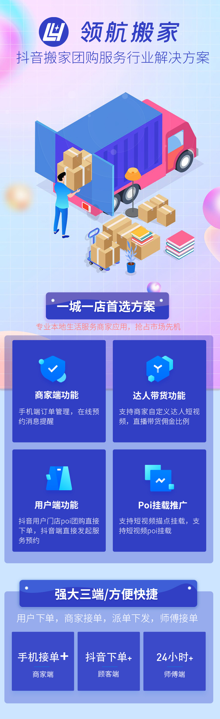 领航到家SAAS抖音团购搬家行业系统支持用户在线下单填写A地点搬迁到B地点,是多层还是电梯,几层楼等设置,C端用户抖音下单预约 ,按照具体详情收取搬家费用,搬家公司收到订单消息提醒,按支持合伙人模式,合伙人可以 招募下级代理,自定义合伙人抽佣比例,自定义代理抽佣比例,领航SAAS系统采用开发框架FastAdmin,抖音端小程序吃才用uinapp设计,系统同步抖音一城一店模式