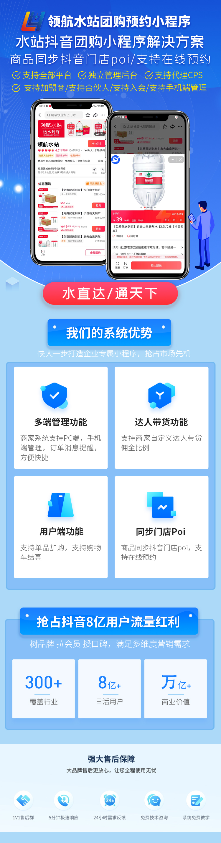 抖音水站团购预约配送给小程序解决方案授权领航到家SAAS系统支持用户在线下单填写配送收货地址,C端用户抖音下单预约 ,公司收到订单消息提醒,按支持合伙人模式,合伙人可以 招募下级代理,自定义合伙人抽佣比例,自定义代理抽佣比例,领航SAAS系统采用开发框架FastAdmin,抖音端小程序吃才用uinapp设计,系统同步抖音一城一店模式